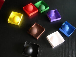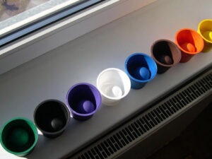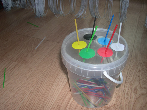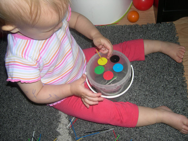 Paaugusiam metinukui vien tik kaišioti pagaliukus pro skylutes – per paprasta. Kad būtų sudėtingiau, paverskite kibirėlį spalvų rūšiuokle :). Tam reikės skaičiavimo pagaliukų ir lipnaus spalvoto popieriaus. Rinkinyje paprastai nebūna baltos spalvos popieriaus, tad baltą skrituliuką iškirpkite iš bet kurios lipdukų knygelės.
