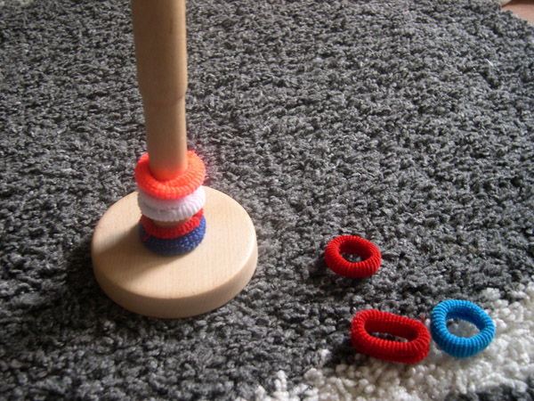 Kai mažyliui tampa per paprasta verti žiedus ant stovo, galima pasiūlyti gumytes, kad toliau tobulintų savo smulkiąją motoriką. Gumytes užmauti galima ant bet ko: popieriaus laikiklio, tualetinio popieriaus ritinėlių.