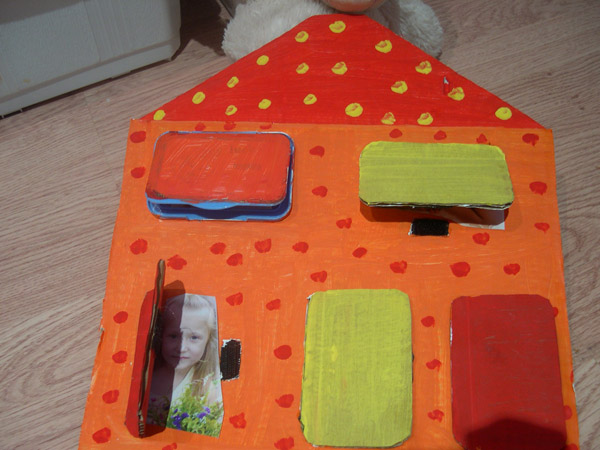Nameliui pagaminti reikia dėžės (galima suklijuoti du lakštus, kad būtų tvirčiau), lipukų, karštų ar kt. stiprių klijų, šeimos nuotraukų. Siūlyčiau pagaminti daugiau durelių, įtraukiant močiutę, senelį, naminį gyvūnėlį. Dureles galima panaudoti ir nuo drėgnų servetėlių.