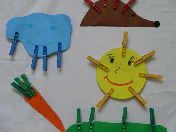 Iš kartono iškirpkite ir nupieškite debesėlį, morką, saulę, žolę, ežiuką ir pan., o skalbinių segtukai atitinkamai tegul būna spinduliukai, lietutis, spygliai, lapeliai.