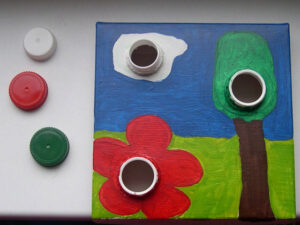 Galima į žaislų dėžę įdėti butelių su užsukamais kamšteliais, bet galima pagaminti štai tokį ar panašų vaikui patrauklų paveiksliuką, panaudojant kamštelius, kurie lavina vaiko smulkiąją motoriką ir mąstymą.