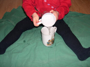 Vonioje ar kambaryje ant patiesalų leiskite vaikui mėgautis vandeniu ir atradimais pilstant. Tam prireiks tik buteliukų ir piltuvėlio (būtinai!)