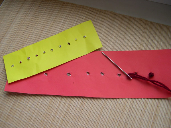 Su didele adata yra paprasčiau varstyti pro skylutes nei su batraiščiu. Jei varstymas batraiščiu dar per sudėtingas užsiėmimas, verta pasiūlyti varstyti su buka didele adata. Tokių bukų adatų tikrai galima atrasti siuvimo reikmenų skyriuje. O jei neturite varstukų, galite tiesiog kartone pradurti skylučių.