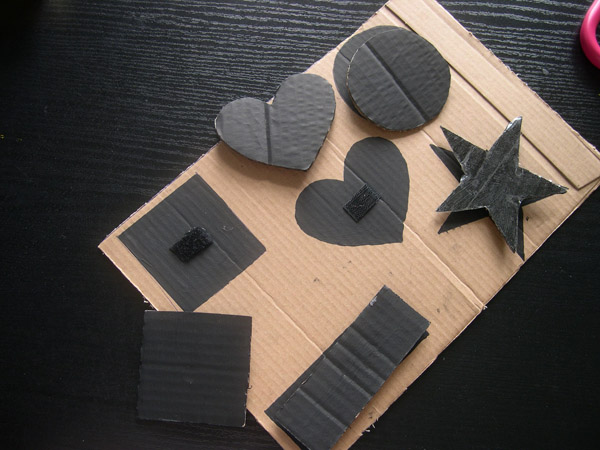 Metinuką būtinai supažindinkite su formomis, nes jie tikrai pajėgūs atskirti jų bent šešias. Ši rūšiuoklė pagaminta iš kartono, formelės su lipukais (jų įsigysite siuvimo reikmenų skyriuje) priklijuojamos. Specialiai vienos spalvos, kad būtų vienintelis rūšiavimo kriterijus – forma. Prilipinti ar atplėšti jūsų mažyliui tikrai patiks!