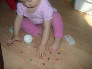 Iki vienerių metų mažyliai daug liečia, ragauja, išmoksta dėti, kišti, suimti smulkius daiktus, o nuo vienerių metų jau reikalingi šiek tiek sudėtingesni žaidimai (nors lietimas ir ragavimas išlieka svarbūs): rūšiavimas, mokymas pastebėti skirtumus, akcentuojamos spalvos, formos, sudėtingėja smulkioji motorika (ne tik užmauti, dėti).