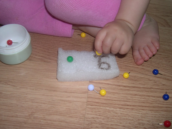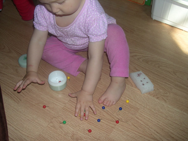 Reikia pasiruošti pagalvėlę ar putplasčio smeigtukams susmeigti. Ant putplasčio galima žymėti taškelius, į kuriuos reikia pataikyti. Žaidimas skirtas mažyliams, kurių tėveliai yra drąsūs ir labai atidūs! Būtina kalbėti kalbėti kalbėti – kad duria, skauda, pavojinga, kaip atsargiai reikia paimti. Tai ne tik smulkiąją motoriką, bet ir mąstymą lavinantis užsiėmimas.