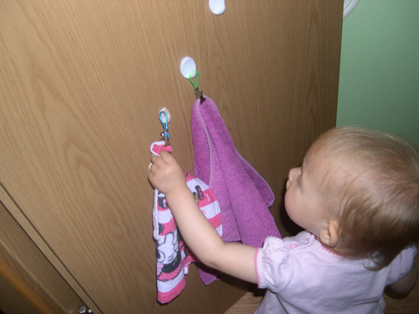 Žaismingų kabliukų galima priklijuoti prie vaiko spintos, ant butelio ar kitur, kad mažylis ką nors kabinėtų ir taip lavintų savo akies – rankos koordinaciją. Bet galima ir praktiškai pasielgti: priklijuoti ant vonios durų kabliukus, o ant jų kabinti vaiko rankšluostėlį. Tad nuplovus rankytes, mažylis ne tik pats galės nusišluostyti, bet ir mokytis pakabinti. Nesijaudinkite, jei iš pradžių viską plėš, temps, nesiseks užkabinti – įgūdžiams formuoti reikia laiko.