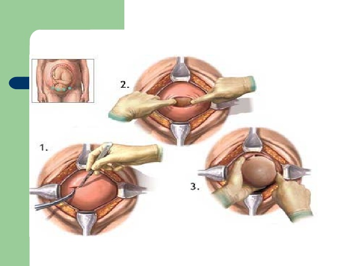 Pradėjus veikti anestezijai, Jūsų pilvas bus nuvalytas antiseptiniu tirpalu ir operuojantis gydytojas  atliks nedidelį horizontalų odos pjūvį virš sąvaržos (vadinamąjį  bikini pjūvį). Prapjovus odą, toliau  bus pjaunami žemiau esantys audiniai, kol bus pasiekti pilvo raumenys, kurie bus praskirti bukuoju  būdu, t. y. jų  nepjaunant. Pasiekus gimdą, operuojantis gydytojas atliks horizontalų gimdos kūno pjūvį apatinėje jos dalyje.