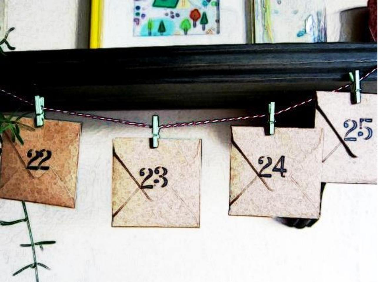Ir koks gi gali būti šventinis laukimas be advento kalendoriaus? Tam, kad nereikėtų pirkti – pasigaminkite jį patys! Norint pagaminti kabantį kalendorių jums reikės: pasirinktos spalvos vokų, kurie atitiks advento dienas, virvelės ar kaspino,  skalbinių segtukų, dažų ar spalvoto tušinuko.
