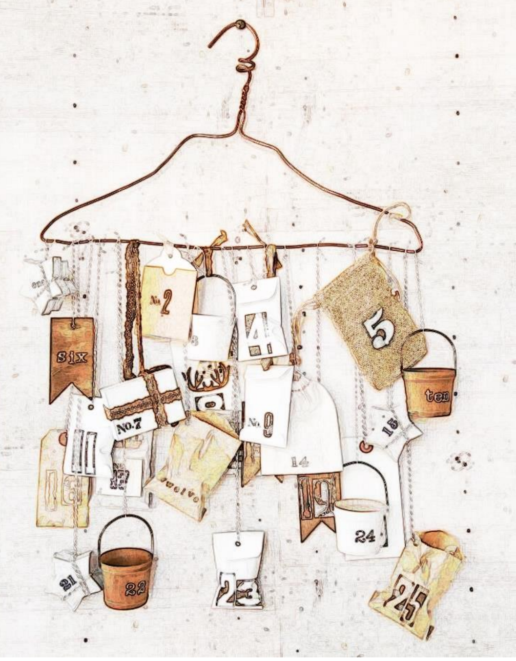 Pasirodo ant rūbų pakabų galima kabinti ne tik drabužius, bet ir advento kalendorių. Jam pagaminti jums reikės: pakabos su pagrindu kelnėms kabinti, puošnių dovanų juostelių ar virvelių, spalvoto tušinuko, vokelių ir iš kartono iškirptų įvairių formelių (skrituliukų, širdučių, žvaigždučių ir kt.).