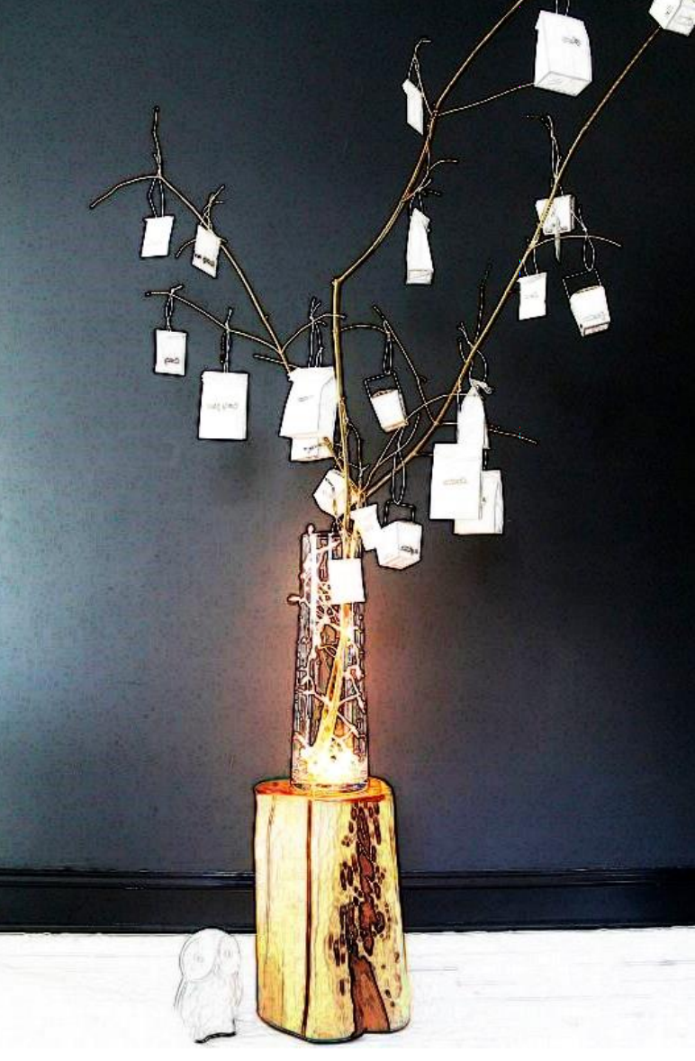 Pirmiausia į vazą sudėkite šakeles ir jų kotelius sutvirtinkite apdėdami akmenėliais, galiausiai papuoškite kankorėžiais. Prie kiekvieno maišelio pritvirtinkite po mažą kortelę su dienos numeriu (tam gali tikti ir nedideli smeigtukai ar žiogeliai) ir užkabinkite juos ant šakelių. Dabar tik belieka į maišelius sudėti staigmenas.