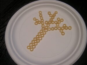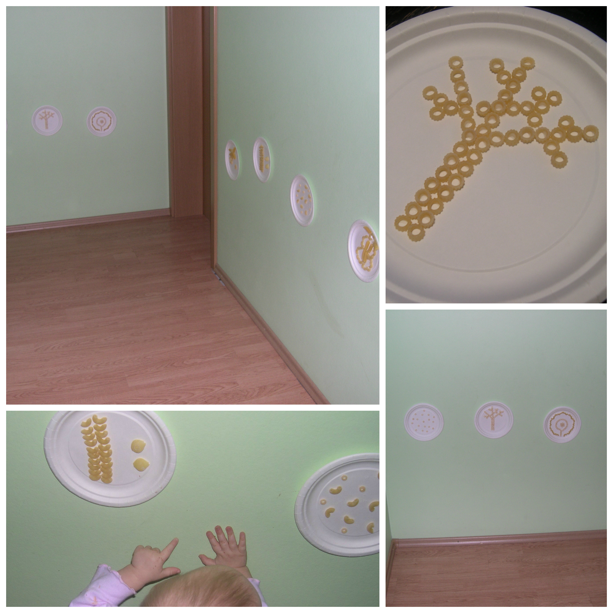 - Palei sieną paskatinsite kūdikį vaikščioti, jei ant jos pakabinsite paveiksliukų. Rekomenduoju pagaminti lėkštes su makaronais. Naudinga bus ir mažiesiems pirštukams. Klijai – lipalas. Prisiklijuoja labai tvirtai. O ant sienos paveikslėlius priklijuoti dvipuse lipnia juosta (kai jų nebereiks, juosta lengvai nuo sienos nusivalo pakaitinus plaukų džiovintuvu). Skatinkite kūdikį palei sieną vaikščiotų į abi puses.
