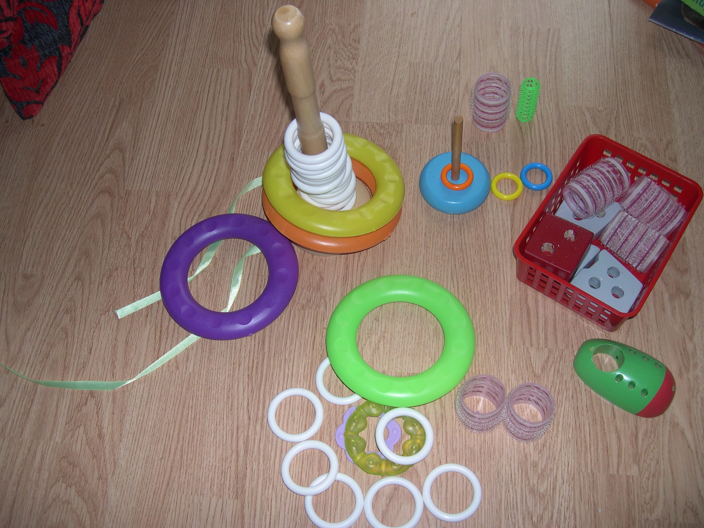 Žaiskite su dideliu (tinka popierinis rankšluosčių laikiklis) ir mažu stovais. Verti galima įvairiausius žiedus (nuo kitų žaislų, užuolaidų), tualetinio popieriaus ritinėlius, plaukų suktukus, kramtukus.