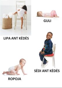 - Dažnai prašyti atlikti paprastus veiksmus: nunešti (ropojant ar jau einant) šiukšlę, paduoti žinomą daiktą.