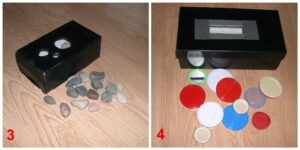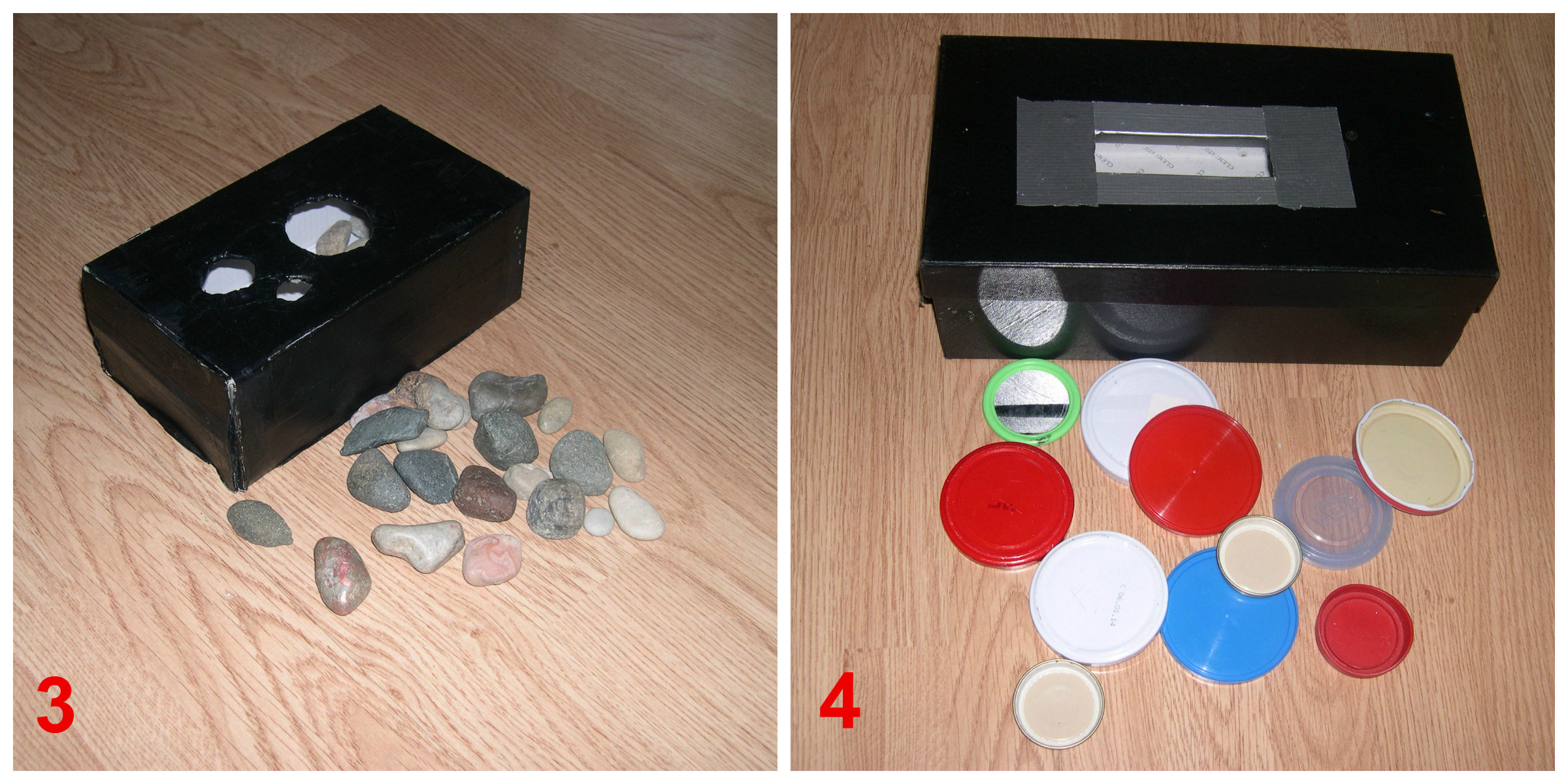 - Dėžutė su įvairaus dydžio skylėmis ir akmenėliai. Raskite du visiškai vienodus akmenėlius – esu tikra, nepavyks :), todėl būtinai jų turėkite tarp žaislų, bet nepasiekiamoje vietoje.