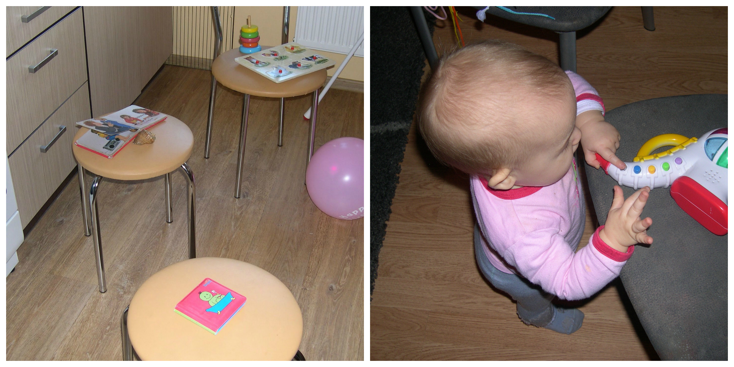 - Vaikščiojimas tarp kėdžių. Ant jų padėkite viliojančių žaisliukų, kurie skatins vaikščioti nuo vienos kėdės iki kitos.