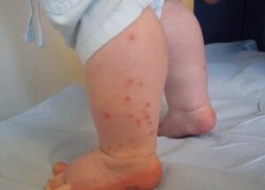 - Odos bėrimas: Labai svarbus ir pavojingas simptomas, būdingas meningokokiniam sepsiui. Tai tamsiai raudonas ar violetinis, netaisyklingos formos bėrimas, panašus į kraujosruvas (hemoraginis). Iš pradžių gali atsirasti kaip maži taškeliai sėdmenų, šlaunų, blauzdų odoje, vėliau greitai plinta, elementai didėja, susilieja. Būdingas požymis – bėrimas neišnyksta jį paspaudus (pvz., permatomos stiklinės dugnu – vadinamasis „stiklinės testas“). Pastebėjus tokį bėrimą, būtina nedelsiant kviesti greitąją pagalbą.
