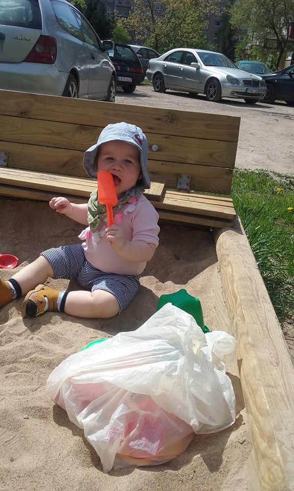 Atradus rodomąjį pirštuką. Nesuprantu iš kur išmoko, kad būtent taip reikia paprašyti: atstato rodomąjį dešinės rankos pirštuką ir beda į norimo daikto pusę, sako  „te“. Žino, kur vandenukas, ant kurios lentynos sausainiai. Taip pat jau pradėjo domėtis mūsų valgomu maistu. Buvau itin nustebus, kai teko dalintis sumuštiniu su lašiša. Nors turi vis tą patį vieną dantuką, bet keptą varškėtį, mano nuostabai, taip pat suvalgė be didesnių problemų. Rodo didelį norą valgyti pati. Neblogai sekasi valgyti pirštukais, net ir košę bando dėtis į burnytę. Prašo šaukštuko ir sau, bet nesileidžia mokoma kaip šaukštuką laikyti, kaip kabinti košę ir ją dėti į burnytę. Tiesiog makaluoja šaukštuką lėkštėje, kartais nuskraidina į burnytę, bet dažniausiai ne tuo galu 🙂