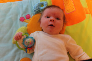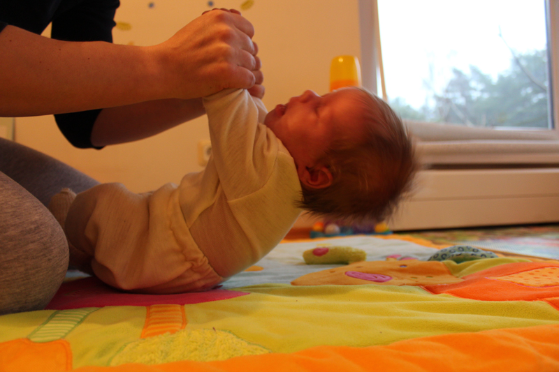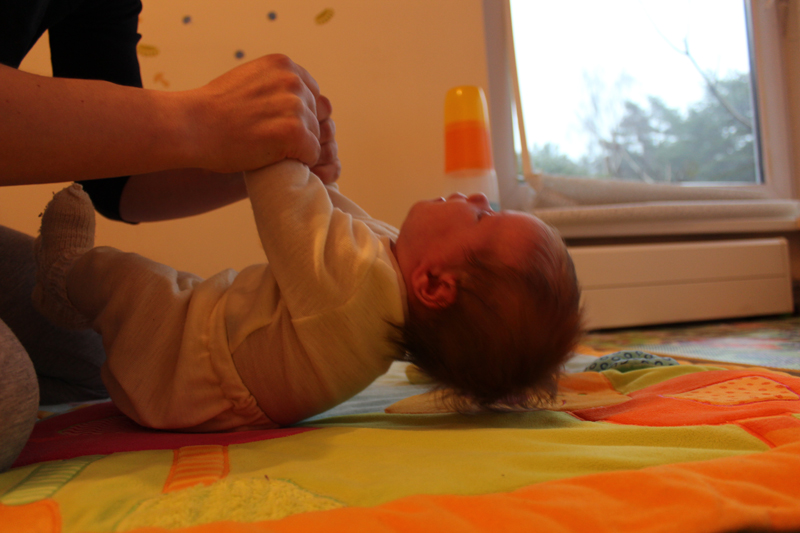 Plaštakos vis dažniau atgniaužtos. Reikėtų atkreipti dėmesį, jei nors vienos rankos kumštelis nuolat sugniaužtas, tai kūdikio griebimo amžius dar nepasiekė vieno mėnesio.