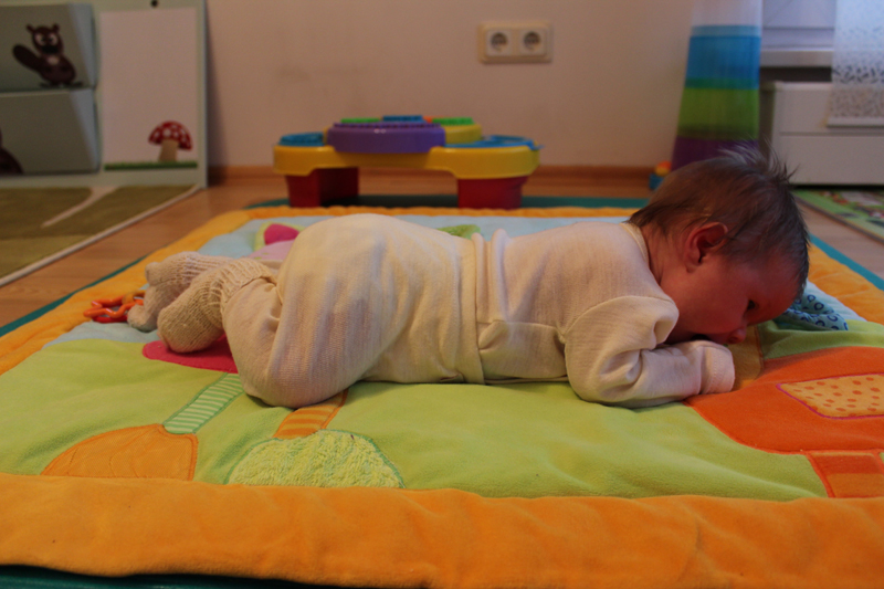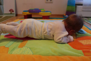 Mažiausiai 10 sekundžių išlaiko galvą per vidurį. Iš vidurio linijos galva neberieda nuolat į šoną, o vis dažniau ir ilgiau laikoma viduryje.