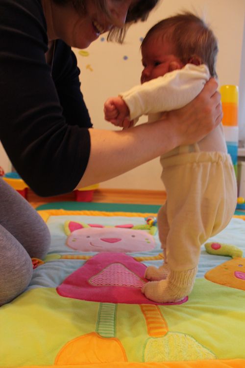 Laikant naujagimį vertikalioje padėtyje ir pakaitomis perkeliant kūno svorį nuo vienos kojos ant kitos, kartoja automatinio žingsniavimo judesius (jis turi išnykti 4-6 gyvenimo savaitę). Žingsniavimo judesiai turi pasireikšti vienodai stipriai abiem pusėms. Rankos tuo metu sulenktos ir kartu su kojomis nejuda.