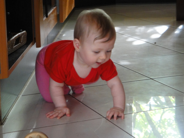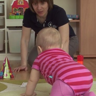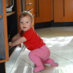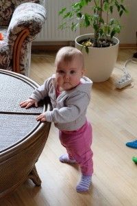 10 mėnesių amžiaus kūdikis ropodamas tyrinėja namų aplinką, pasiekia norimą daiktą. Ropojimą papildo savarankiško atsistojimo įgūdžiai. Jei pastebėjote, kad Jūsų kūdikis, būdamas 10-12 mėnesių amžiaus dar nerodo noro ir nemėgina tai atlikti, tai šioje vaizdinėje medžiagoje išvysite, kaip mokinti kūdikį atsistoti prie baldo atsispiriant viena koja. Kai įsikibęs į tvirtą pagrindą (pvz. baldą) kūdikis stojasi, bet jau nebesitraukia į viršų vien rankomis, turėtų mokytis pereiti į klūpimą padėtį, kad saugiai nusileistų ant žemės. Kaip paskatinti kūdikį atlikti šį judesį išvysite vaizdinėje medžiagoje. Išmokęs atsistoti ir atsiklaupti, kūdikis toliau bando įveikti atstumus laikydamasis į baldus, eidamas šoniniu žingsniu. Tokiu būdu stiprėja dubens, šlaunų stambiosios raumenų grupės, lavėja pusiausvyra ir judesių koordinacija. Tai pereinamas etapas, kol Jūsų kūdikis pradės savarankiškai vaikščioti. Jei pastebite, kad Jūsų kūdikis vis dar nerodo pastangų eiti šoniniu žingsniu, tuomet vaizdinėje medžiagoje išvysite, kaip paskatinti kūdikį eiti šoniniu žingsniu. Kai kūdikis jau drąsiai eina šoniniu žingsniu pagal baldus, mokiname kūdikį įveikti trumpus atstumus tarp baldų, taip kaip parodyta vaizdinėje medžiagoje. Namuose tikrai rasite daiktų, tokių, kaip vaikiška kėdutė, pufas, ar žaislų dėžė, kurią kūdikis pradės stumdyti. Todėl vaizdinėje medžiagoje matysite, kaip galite paskatinti kūdikį perkelti kūno svorį jam einant ant kelių ar stovint, stumdant prieš tai paminėtus daiktus.