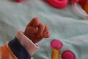 • Plaštakos vis dažniau atgniaužtos. Reikėtų atkreipti dėmesį, jei nors vienos rankos kumštelis nuolat sugniaužtas, tai kūdikio griebimo amžius dar nepasiekė vieno mėnesio.