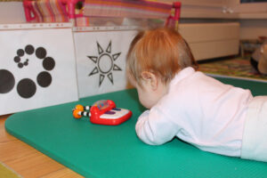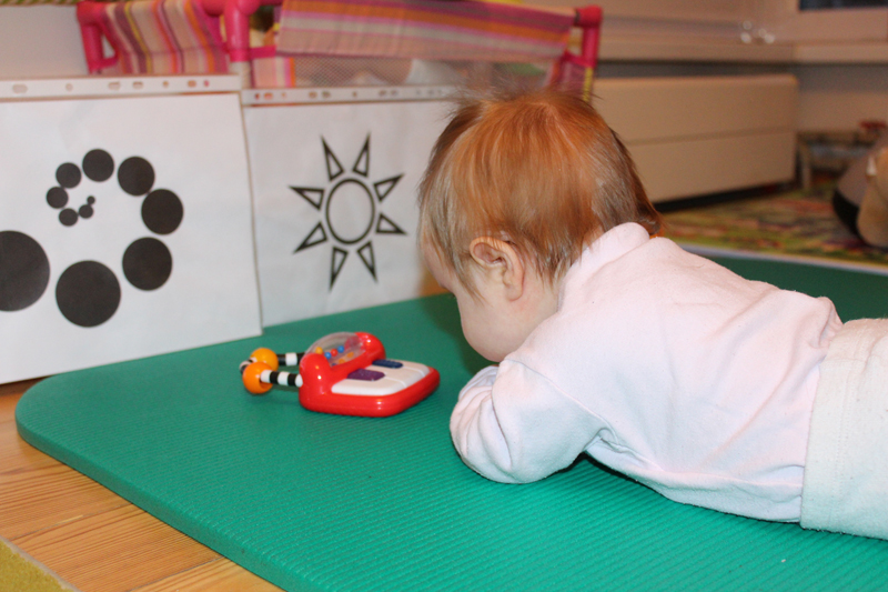 • Seka akimis raudoną barškutį nuo vieno akių kampučio iki kito. Prieš kūdikio akis 15-20 cm atstumu nuo jo veido laikant raudoną barškutį laukti kol kūdikis žvilgsniu užfiksuos barškutį, ir tada jei, kūdikis laiko galvą tiesiai, ramiai ir lėtai judinti barškutį į vieną ir kitą pusę.