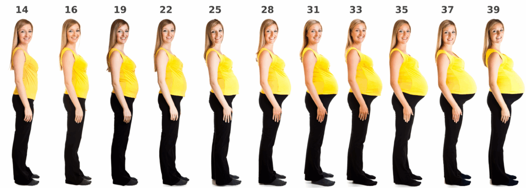 Pirmą kartą gimdysiančių moterų pilvelis paprastai pradeda matytis apie 14–18 nėštumo savaitę, antrą kartą gimdančių – šiek tiek anksčiau. Paveiksle matyti, kaip pamažu kinta moters figūra nėštumo metu.