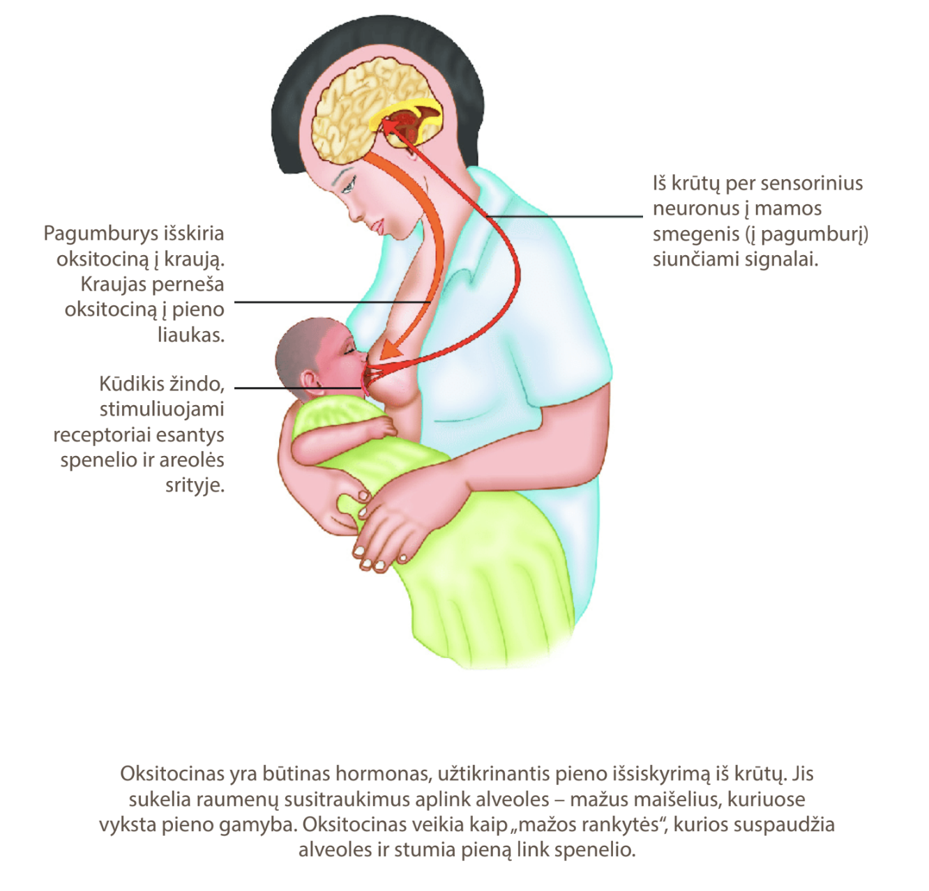 2. Pieno „paleidimo“ refleksas: Pienas krūtyse nesikaupia vienoje talpykloje kaip butelyje. Jis gaminasi ir kaupiasi daugybėje smulkių alveolių („maišelių“), o teka plonyčiais latakėliais. Tam, kad pienas pradėtų lengvai tekėti iš krūties, turi suveikti pieno „paleidimo“ (atpalaidavimo) refleksas, kurį sukelia hormonas oksitocinas.