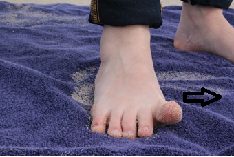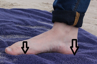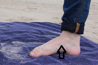 6. Kulną ir kojos pirštus laikykite prispaustus prie žemės. Po to įtempkite pado raumenis ir kelkite pėdos vidinį skliautą aukštyn. Kulnas ir kojų pirštai neturi judėti pratimo metu.
