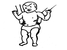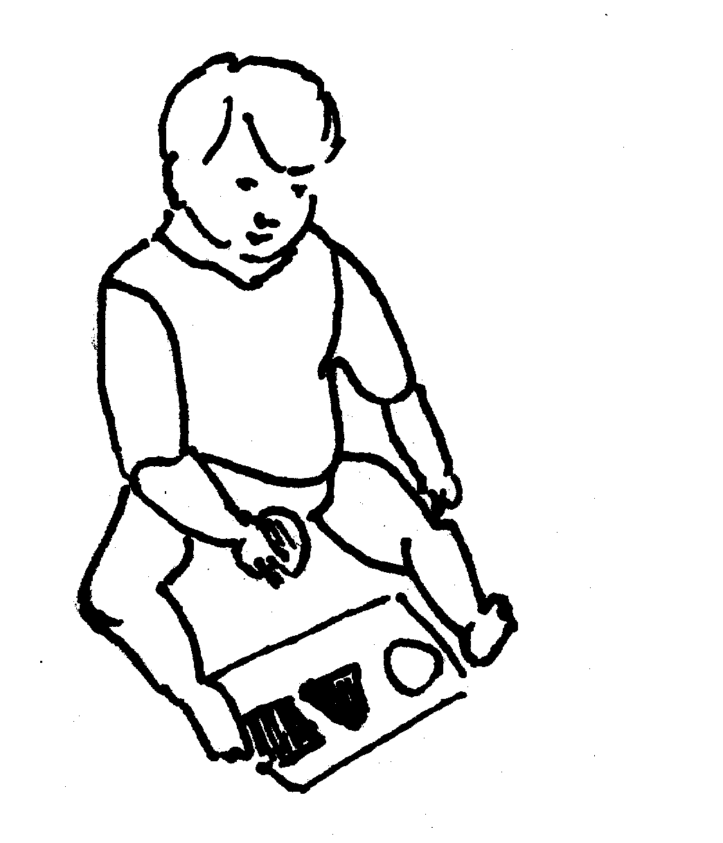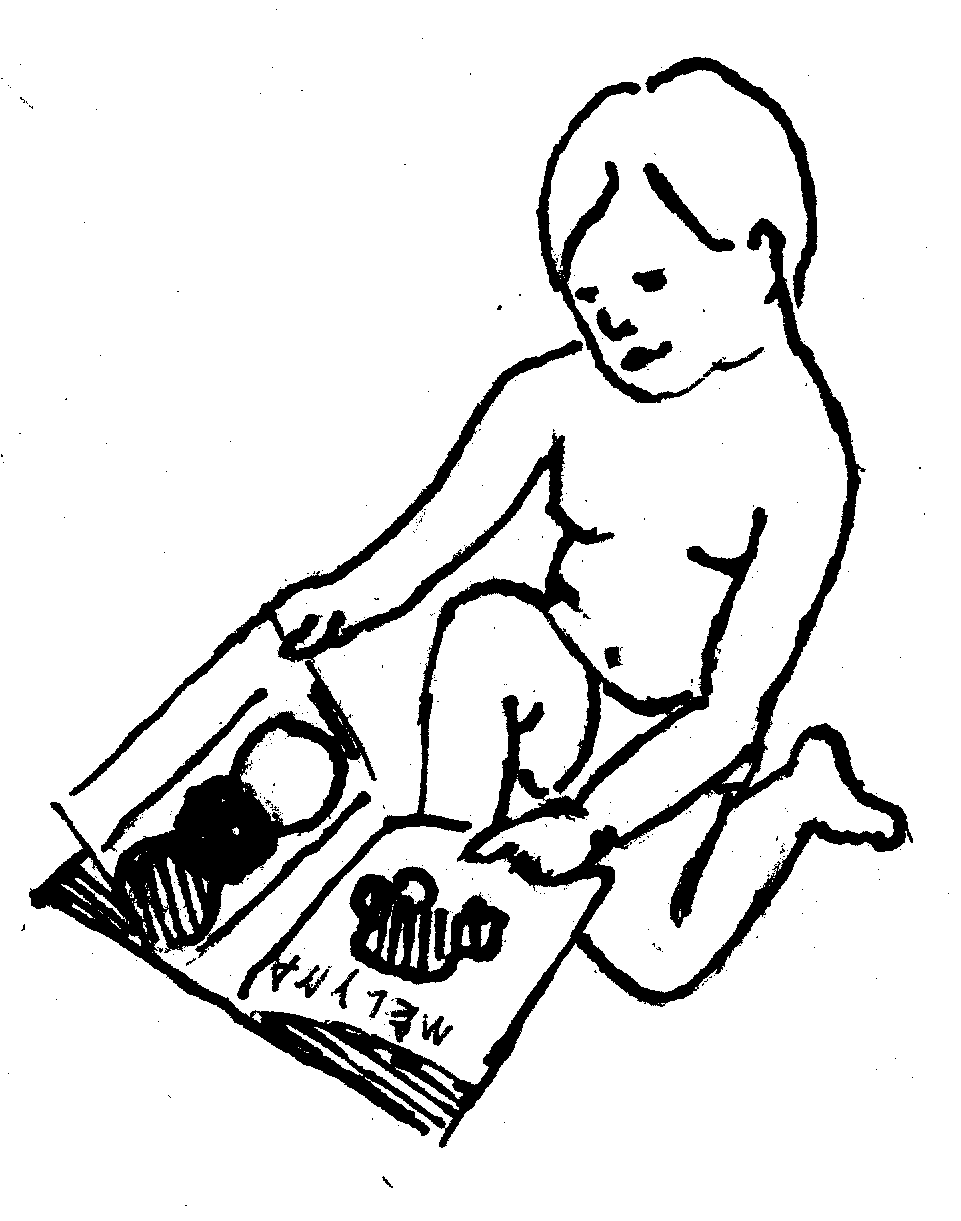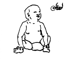 2.3. Vaikas lokalizuoja garso šaltinį. Vaikui sėdint mamai ant kelių iš nugaros pusės 10–15 cm atstumu nuo ausies pabarškinama barškučiu ar paskambinama varpeliu. Vaikas pasuka galvą ir akis garso  link. image011