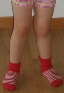 - Kaulų deformacijos: „O” arba „X” formos kojos, krūtinės ląstos deformacijos (pvz., „rachitiniai karoliai“ – sustorėjimai šonkaulių ir krūtinkaulio jungtyse, „vištos krūtinė“), dubens deformacijos, kartais – stuburo iškrypimai (kuprelė).